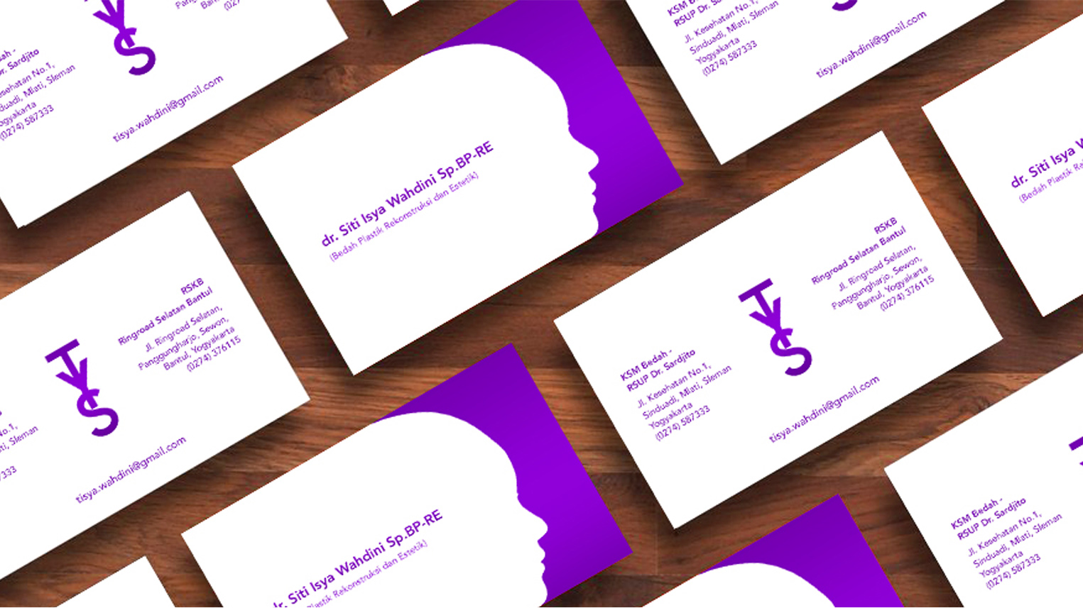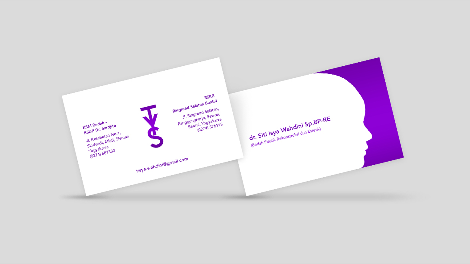 A business card design for dr. Tisya, a plastic surgery doctor. Using a purple color give a friendly feeling to patient. A face side illustration include on the card and give a clue about dr. Tisya’s job. There is also a unique logo of dr Tisya name. An information about dr. Tisya’s clinic and contact also represent on the card. Easy to read and understand.